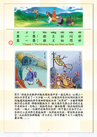 猴住进山洞里,群猴拥戴他为王。猴王离开花果山去寻找长生